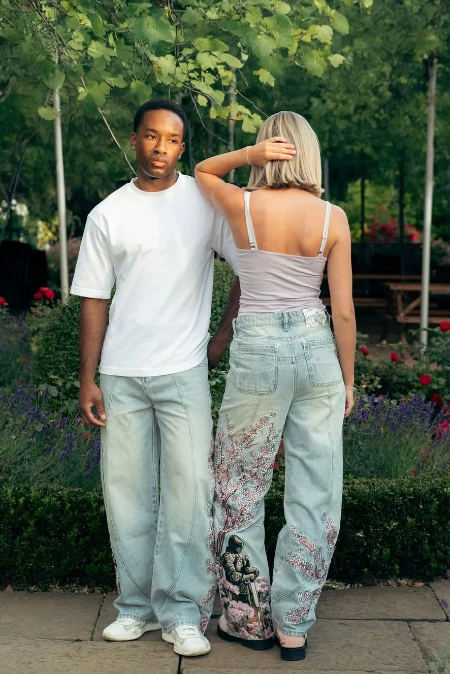 Step into denim that tells a story. These straight-leg jeans feature intricate embroidery at the hem — delicate cherry blossoms entwine with a poised warrior, creating a striking balance of grace and strength. Crafted from sturdy, non-stretch cotton denim, they hold their shape while softening with wear. Classic four-pocket styling and a mid-rise waist keep the look timeless, while the detailed artwork makes it anything but ordinary. Perfect for pairing with a simple tee or structured blazer to let the embroidery speak for itself.